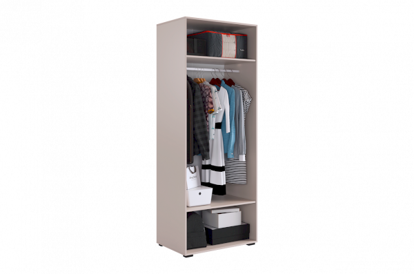 Шкаф оснащён длинными пластиковыми ручками и имеет удобное внутреннее наполнение: две большие полки и одна длинная штанга. Это позволяет рационально использовать пространство и разместить различные типы одежды.