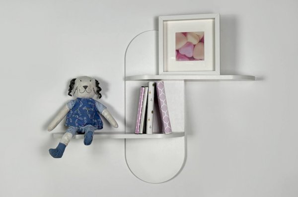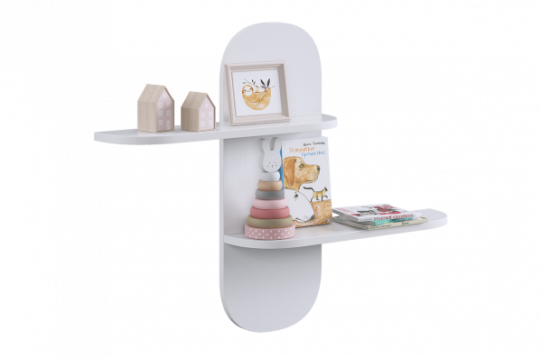 Полка выполнена из ЛДСП, что обеспечивает прочность и надёжность конструкции. Модель оснащена двумя открытыми полками, на которых удобно разместить книги, игрушки, декоративные элементы или учебные принадлежности. Открытый формат делает нужные вещи всегда доступными и визуально не перегружает пространство.