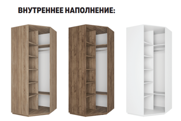 - Солидное наполнение: с левой стороны углового шкафа располагается 5 полок, с правой — две полки и штанга для одежды